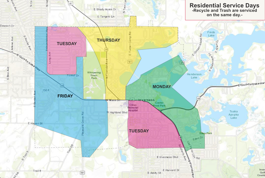 Household garbage is picked-up once per week for each residence, the pick-up days are: Monday, Tuesday, Wednesday, Thursday, and Friday. Residential customers can see the scheduled service days map on the Trash Pick-Up Schedule.
